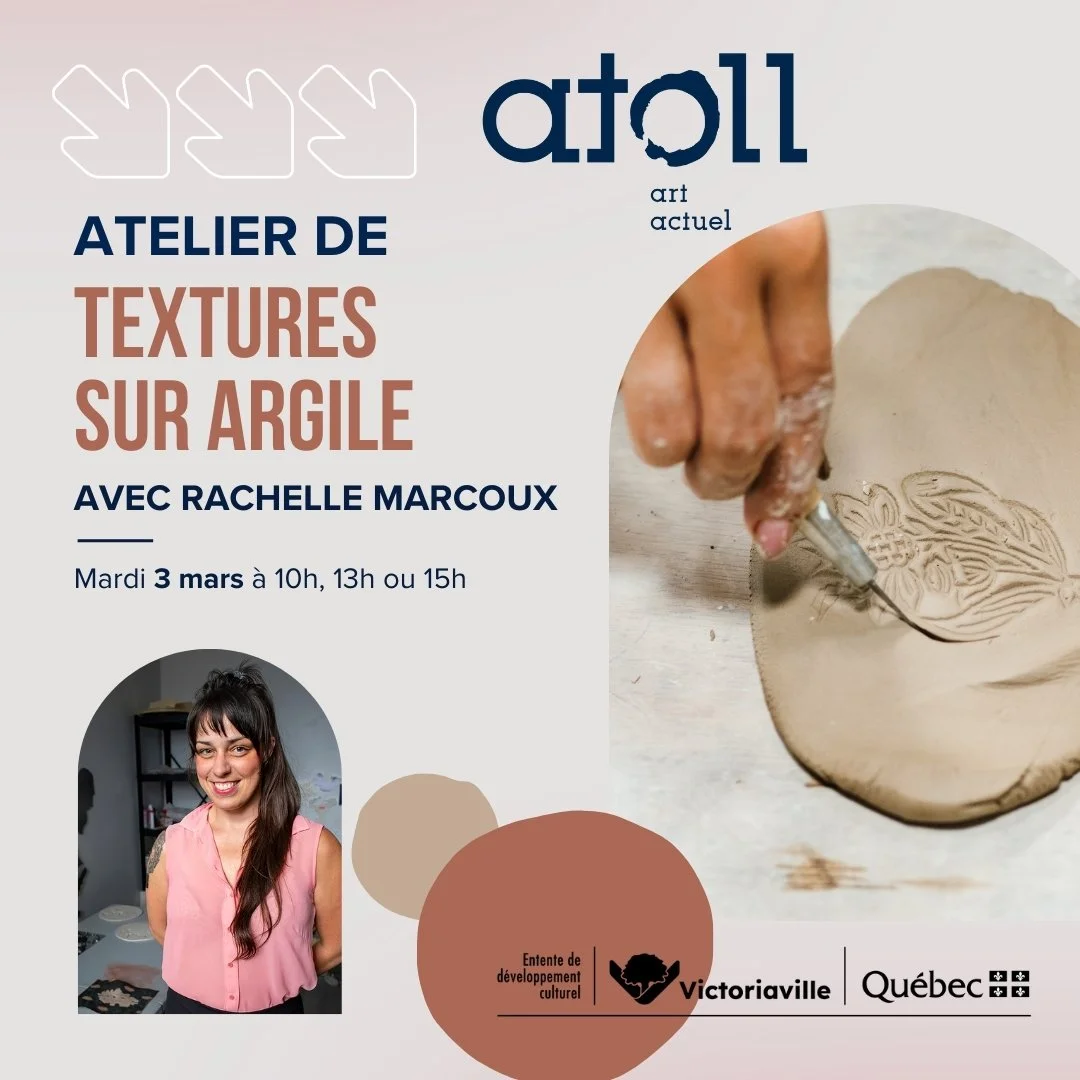 *IMPORTANT: Puisque l'argile doit sécher, les œuvres devront rester sur place à la fin de l'atelier. Les participant·e·s pourront venir récupérer leur(s) création(s) le vendredi 6 mars, entre 13h et 16h, chez Atoll art actuel. À cette occasion, il sera également possible de peindre et décorer son objet avec le matériel qui sera mis à votre disposition.